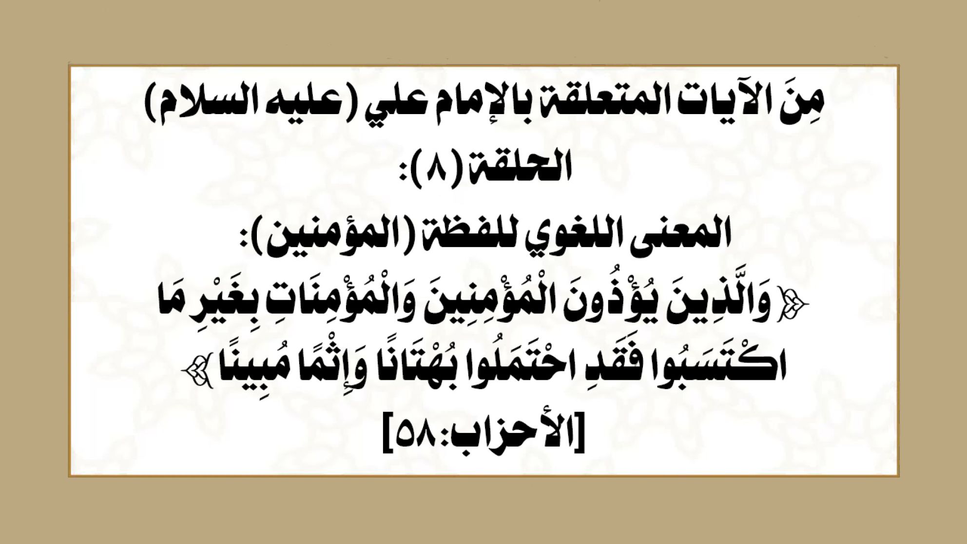 مِنَ الآيات المتعلقة بالإمام علي (عليه السلام) الحلقة (8): المعنى اللغوي للفظة (المؤمنين): ﴿وَالَّذِينَ يُؤْذُونَ الْمُؤْمِنِينَ وَالْمُؤْمِنَاتِ بِغَيْرِ مَا اكْتَسَبُوا فَقَدِ احْتَمَلُوا بُهْتَانًا وَإِثْمًا مُبِينًا﴾ [الأحزاب:58]