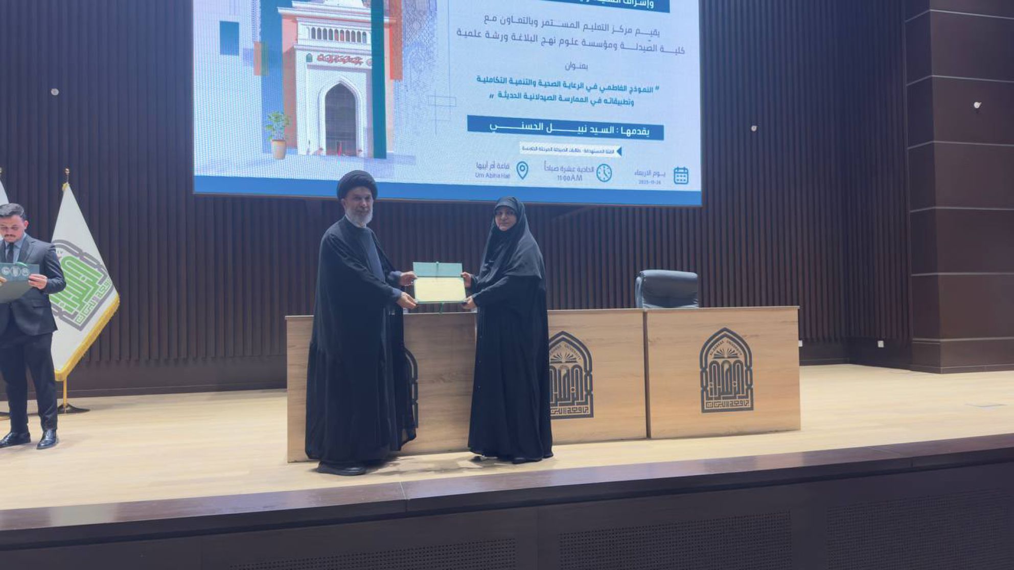 أقامت مؤسسة علوم نهج البلاغة ورشة علمية بعنوان "النموذج الفاطمي في الرعاية الصحية التكاملية وتطبيقاته في الممارسة الصيدلانية الحديثة" قدّمها رئيس المؤسسة السيد نبيل الحسني الكربلائي، وذلك بالتعاون مع مركز التعليم المستمر وكلية الصيدلة في جامعة الزهراء (عليها السلام)، وبالتزامن مع إحياء ذكرى شهادة السيدة الزهراء (عليها السلام).
